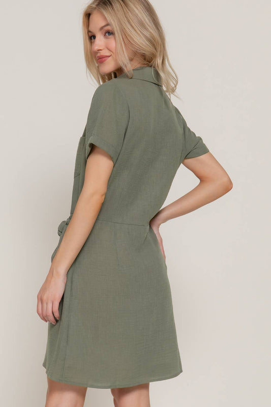 Short Sleeve Button Down Side Bow Linen Effect Mini Dress