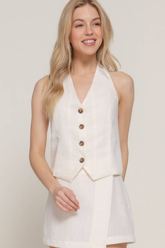 Halter Neck w/ Bow Tie Closure Button Down Linen Effect Top