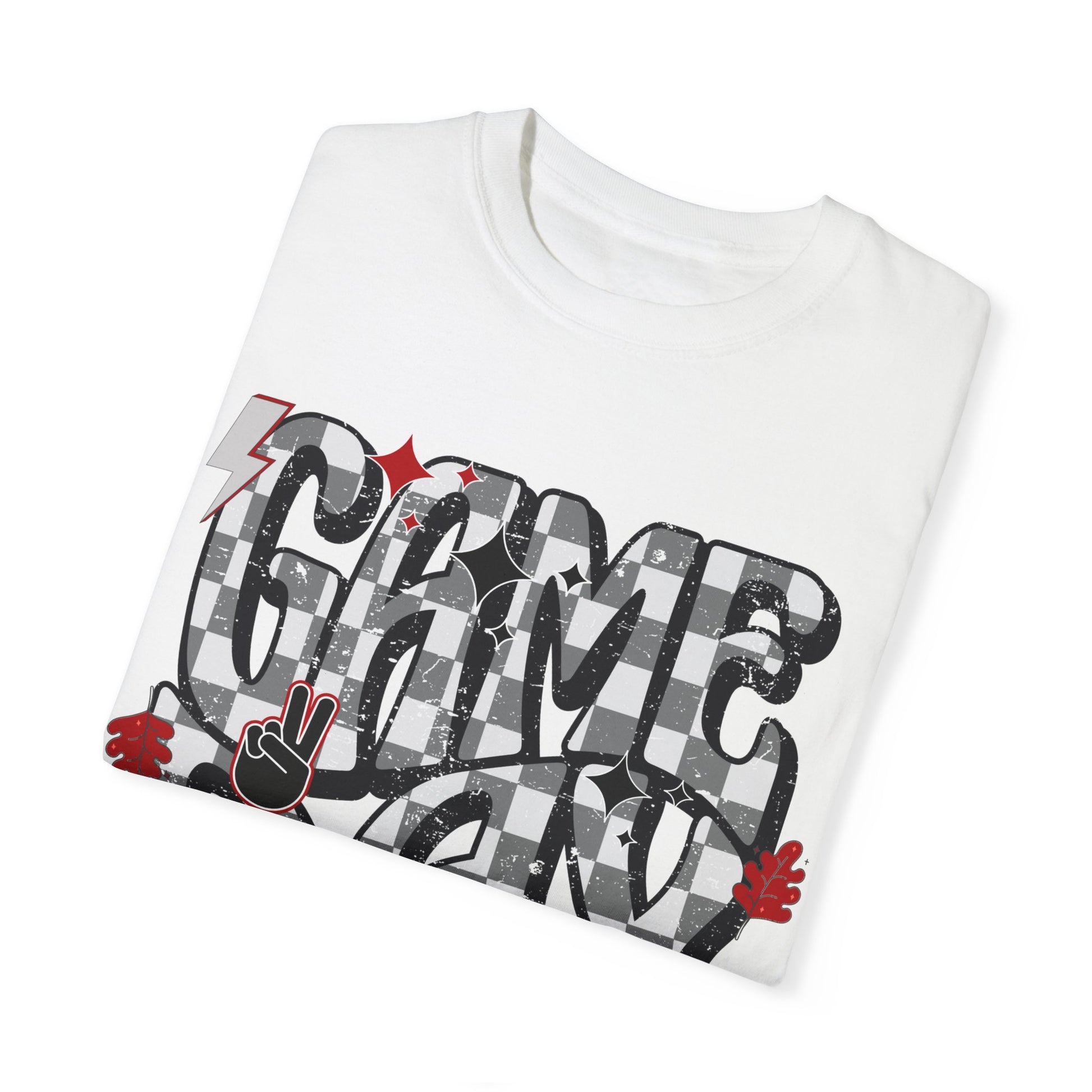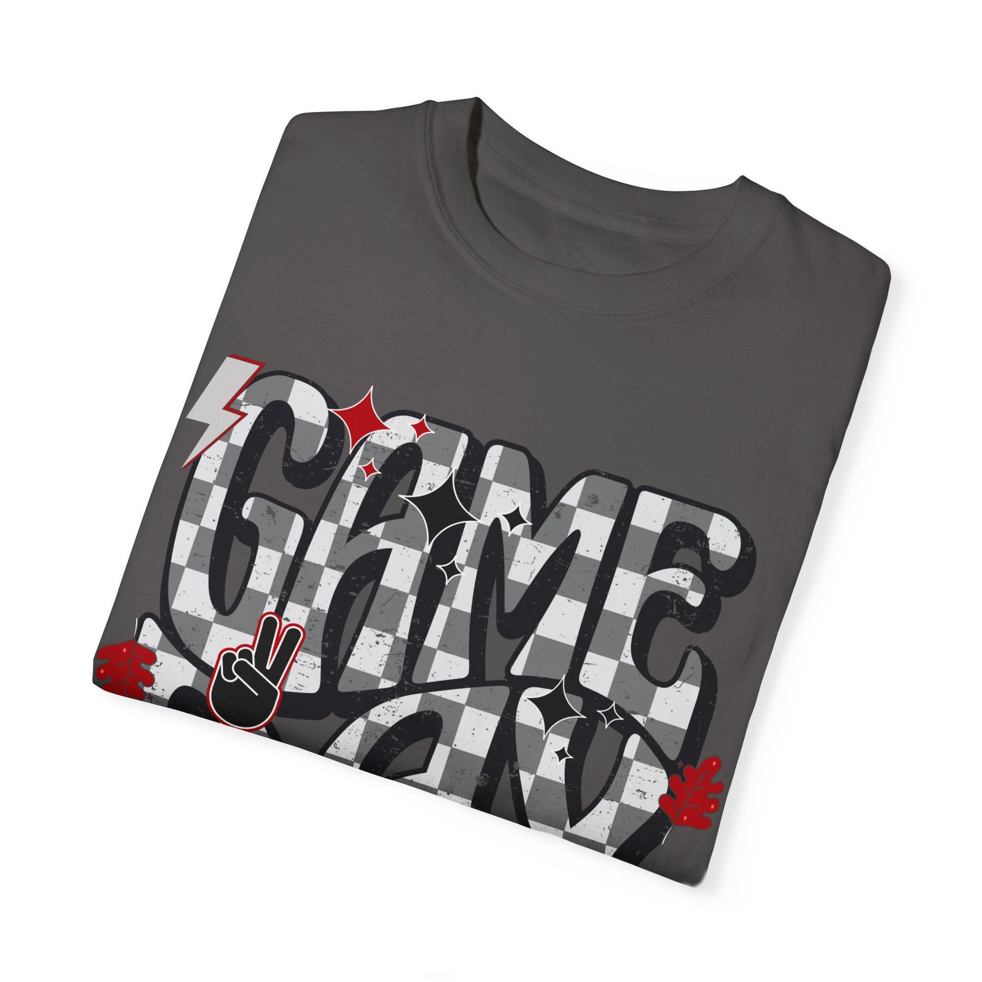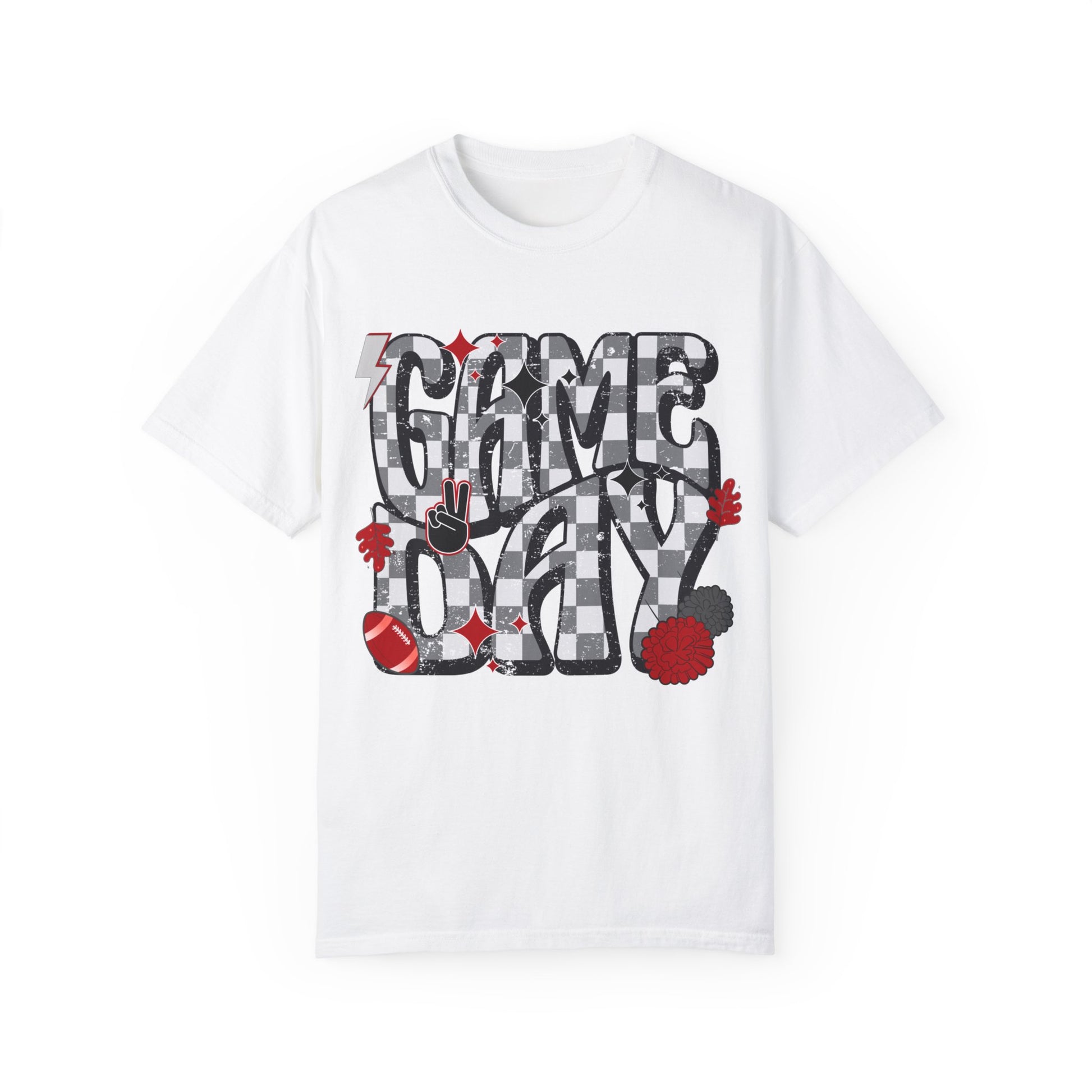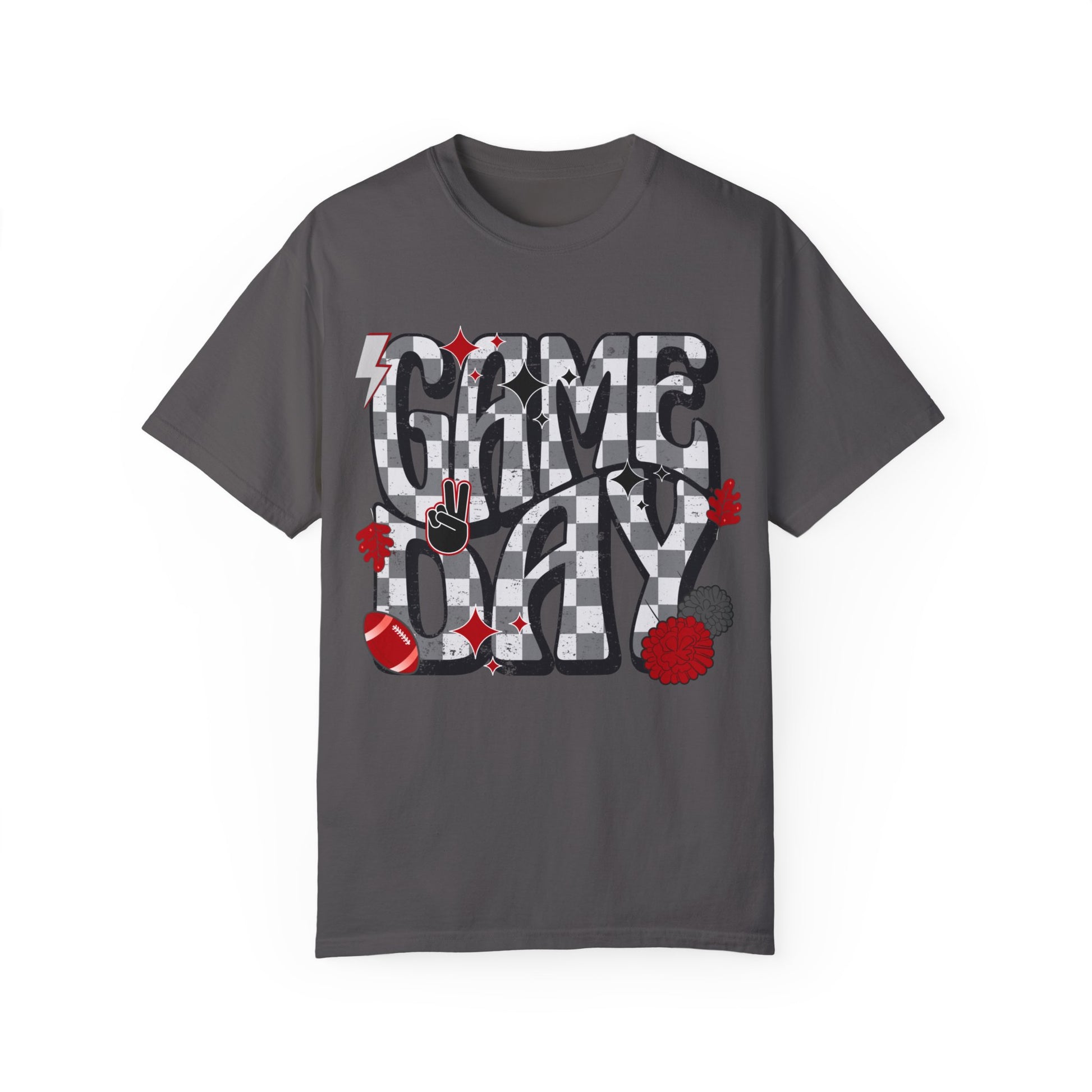 This checkered Game Day T-shirt in blue and orange gives off a sporty and vibrant vibe, perfect for game days, tailgates, and casual outings. It is ideal for sports fans and anyone looking to show off their team spirit.